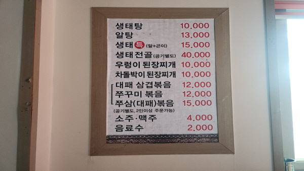 생태탕,알탕,우렁이 된장찌개,대패삼겹볶음,쭈꾸미볶음