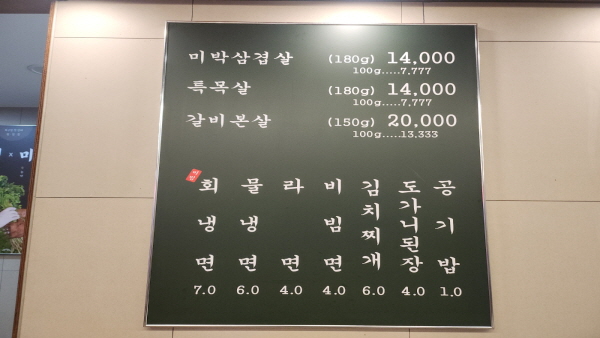 미박삼겁살,특목살,갈비본살,회냉면,김치찌개,도가니된장찌개
